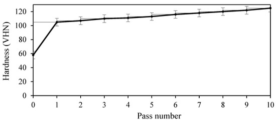 Figure 14 shows the average Vickers microhardness of the as annealed and the modified-CSP samples versus the number of passes. According to Figure 14, when the number of passes increases, the average Vickers microhardness has increased. The average Vickers microhardness of the annealed sample, 58 VHN, reached 105 VHN in the first pass. Such increase in the average Vickers microhardness from the as annealed to the first pass stands for microstructure evolution. In general, plastic deformation can be related to the evolution of dislocations and the interaction of dislocations. There are several proposed models which deal with generation and annihilation of dislocations in plastic deformation of polycrystalline metals [14,25]. The annealed sample has low dislocation density. Seemingly, in the first pass, a significant increase was recorded both in density of dislocation and in intersection of dislocations. In other words, the generation of dislocation occurs in the first pass. In this way, an increase occurs in the average Vickers microhardness from the as annealed to the first pass. However, as the process continues from the first to tenth passes, the process of incremental changes becomes less intense. These changes are caused by simultaneous generation and dislocation annihilation and their collisions with each other. After the first pass to the tenth pass, a gradual increase occurs in the average Vickers microhardness. In comparison with the first pass, in the tenth pass, the Vickers microhardness rose to 125 VHN. Apparently, after first pass changes occurring in hardness are related to the generation and annihilation of dislocations.