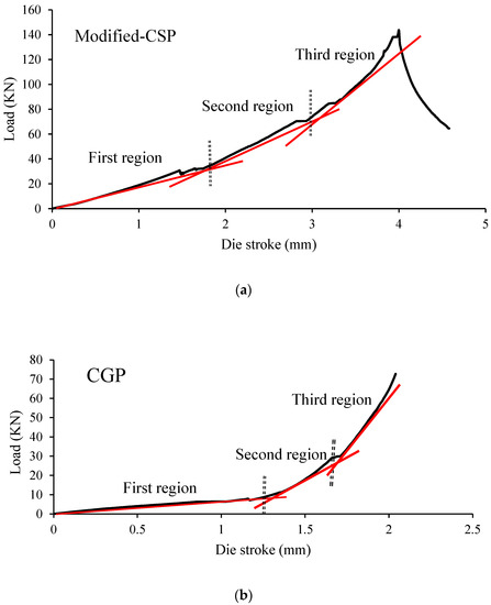 - The load-die stroke diagram of CGP and modified-CSP includes three transition steps. CGP has several drastic conversion steps, whereas for modified-CSP the transition steps are quite uniform. In modified-CSP, the load-die stroke diagram increases almost uniformly due to elimination of interface region of the studs and the gradual engagement of dies with the sheet.