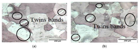 An optical microscope image of the annealed copper sheet has been depicted in Figure 17. The Hyn method has been used to measure the grain size. According to Figure 17, the grains in the annealed sample have an average size of 35 μm and an inhomogeneous distribution. As can be seen in Figure 18a,b, in the first pass, with severe plastic deformation grain refinement has occurred, while in the tenth pass, with an increase in the number of passes, this refinement has increased. Moreover, according to Figure 18b, in the tenth pass, bimodal structures are observed, plus fine and coarse grains are placed next to each other, which is one of the characteristics created in samples under SPD processes [28,33].
