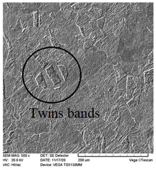 Figure 19 illustrates the SEM micrograph of the sheet sample produced in the tenth pass by the modified-CSP method. The twins bands have been shown in Figure 19. Sliding and twinning are the two main mechanisms for plastic deformation in materials. In the early stages, grain sliding helps initiate the plastic deformation process. Meyers et al. [19] claimed that for the onset of mechanical twinning in metals with a low Stacking Fault Energy (SFE), such as pure copper, the critical dislocations density has to be reached. The mechanical twinning mechanism is activated by reaching the minimum density of dislocations and the critical shear stress. It should be mentioned that mechanical twins occur at high strains.