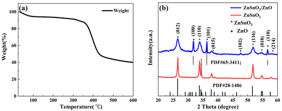 (a) TG results of ZnSnO3 precursors; (b) XRD patterns of ZnSnO3 and ZnSnO3/ZnO calcined at 450 °C.