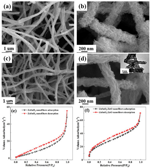 SEM images of ZnSnO3 and ZnSnO3/ZnO: (a,b) ZnSnO3, (c,d) ZnSnO3/ZnO, the inset in (d) TEM image of ZnSnO3/ZnO; (e,f) N2 adsorption–desorption isotherms of ZnSnO3 and ZnSnO3/ZnO nanofibers.