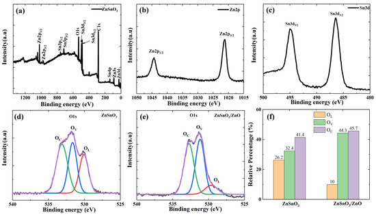 XPS is carried out to study the elemental composition and valence states in ZnSnO3/ZnO, and the results are shown in Figure 3. Figure 3a shows the full XPS spectrum of the ZnSnO3/ZnO nanofibers; we can observe that the obtained ZnSnO3/ZnO nanofibers contain the elements Zn, Sn, C, and O. The peak at 284.8 eV corresponds to the spin-orbit peak of C 1s. The broad XPS spectrums of the Zn 2p range, Sn 3d, and O 1s range are shown in Figure 3b–d. In the case of the Zn 2p spectrum, the Zn 2p peak can be distributed into two signals, as shown in Figure 3b. The Zn-2p3/2 and Zn-2p1/2 signals are focused at 1021.1 eV and 1044.1 eV, respectively, which indicates that the chemical valence of Zn in the system is +2 [22]. As shown in Figure 3c, the two peaks at 486.8 and 495.1 eV correspond to the Sn 3d5/2 and Sn 3d3/2 spin-orbit peaks, respectively. The bimodal spin-orbit shows a split value of approximately 8.3 eV, indicating the presence of Sn4+ cations [23]. The O 1s spectrum of the ZnSnO3 and ZnSnO3/ZnO is illustrated in Figure 3d,e, which is deconvolved into three characteristic peaks by Gaussian fitting [16,24]. The three fitting peaks are attributed to three essential oxygen species [25], which are denoted as OL, OV, and OC, respectively, corresponding to O2− species in the lattice oxygen species, vacancy oxygen species (VOS), and chemically adsorbed or dissociated oxygen species, respectively [26]. The three characteristic peaks of O 1s in the ZnSnO3 nanofibers are located at 530.06 eV, 531.65 eV, and 533.13 eV. In contrast, the distinct peaks of O 1s in the ZnSnO3/ZnO nanofibers are located at 529.99 eV, 531.33 eV, and 532.27 eV, which can be ascribed to the three significant oxygen species, represented as OL, OV, and OC, respectively [17,27]. It must be pointed out that the gas-sensing properties may be highly dependent on the type of VO (vacancy oxygen) present on the semiconductor surface [28]. The proportion of oxygen species in the obtained ZnSnO3 and ZnSnO3/ZnO nanofibers are shown in Figure 3f and Table 1. The results of Figure 3f and Table 1 clearly indicate that compared with the percentage of Ov of ZnSnO3 nanofibers, that of ZnSnO3/ZnO nanofibers is substantially larger.