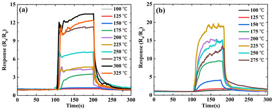 Response of ZnSnO3 and ZnSnO3/ZnO toward 50 ppm ethanol at different temperatures: (a) ZnSnO3; (b) ZnSnO3/ZnO.