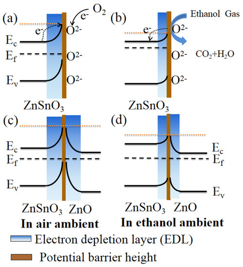 According to reference [15], since both ZnSnO3 and ZnO are N-type semiconductor materials, ZnO is successfully compounded with ZnSnO3 to form a homotypic heterojunction (i.e., N-N junction); this N-N junction is a critical factor in improving the ethanol gas sensitivity between ZnSnO3 and ZnO. There were differences in the Fermi energy levels of the two connected semiconductor compounds. The transfer of electrons from higher energy states to lower energy states until equilibrium is reached at the Fermi energy level resulted in the formation of a depletion layer in the interface region. In contrast to ZnSnO3, the electrons on the ZnSnO3 conduction band in the ZnSnO3/ZnO sample are transferred to the ZnO conduction band to be trapped by oxygen molecules, resulting in the formation of a large number of oxygen anions. At the same time, the electron depletion layer appears near the surface of ZnSnO3/ZnO, which is an essential component of the gas-sensing process. In an air environment, the increased height of the potential barrier of the ZnSnO3/ZnO heterostructured composite makes electron transfer more difficult (as shown in Figure 6c), which also leads to a significant increase in sensor resistance (Ra). In an ethanol environment, the reaction of ethanol molecules with oxygen ions releases electrons back into the ZnSnO3/ZnO heterojunction, resulting in an increase in electron concentration. This reduces the potential barrier height of ZnSnO3 and ZnO, considerably reducing the sensor resistance (Rg), as shown in Figure 6d. The analysis of the above gas-sensitive properties reveals that compared to the ZnSnO3 nanofibers, the heterogeneous structure of the ZnSnO3/ZnO composite nanofibers enhances electron transport and enables the effective separation of electrons and holes. According to Equation (1) and Equation (2), the larger specific surface area of ZnSnO3/ZnO facilitates the adsorption of more oxygen on its surface, producing a large amount of oxygen ions, thus resulting in higher sensor resistance (Ra) and the lower sensor resistance (Rg). So, the gas-sensing response of ZnSnO3/ZnO composite nanofibers increases.