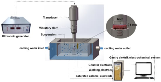 Solution-annealed 316L SS (heated at 1050 °C for 1 h and then quenched in water) was selected as the experimental material due to its superior corrosion resistance and good mechanical properties [29,30,31]. The chemical composition of 316L SS used in the experiment is shown in Table 1, and the dimensions of the CE samples are displayed in Figure 1. All CE specimens were ground by 400-grit, 1000-grit and 2000-grit sandpapers in sequence; then, they were polished using diamond grinding paste with a particle diameter of 0.5 μm. Ultrasonic CE equipment made by Nanjing Xian Ou Instrument Manufacturing Co., Ltd, Nanjing, China. was used for the CE tests, as shown in Figure 2, and the working temperature was maintained at 25 ± 2 °C using a temperature control box. The horn tip was held at a depth of 15 mm in 3.5 wt.% NaCl solution, and the CE specimen was placed co-axially with the horn fixed a distance of 1 mm from the horn tip. CE tests were performed according to ASTM Standard G32-10 [32]. Detailed parameters can be obtained from our previous research studies [27,33].