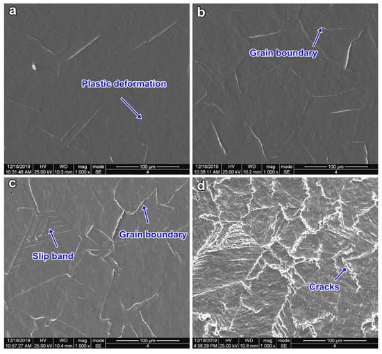 Surface morphologies of 316L SS with different amplitudes of CE: (a) 5 μm for 2 h CE, (b) 25 μm for 2 h CE, (c) 55 μm for 2 h CE and (d) 55 μm for 4 h CE.