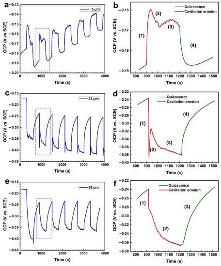 An alternating OCP under quiescence and a higher amplitude CE of 55 μm is displayed in Figure 4e,f. OCP gradually decreases from −239.3 mV to −367.7 mV during the CE period, which is different from the case involving an amplitude of 25 μm. With a higher cavitation intensity corresponding to 55 μm amplitude, the passive films suffer more serious damage due to a higher cavitation intensity being compared to the mechanical bearing capacity of the passive films, making the anodic reaction dominant during the CE period (stage 1 and stage 2). Subsequently, OCP shifts quickly toward the noble direction when CE is switched off, exhibiting clear repassivation behavior similar to the case with an amplitude of 25 μm (stage 3). The destruction of the passive films is more serious after the CE period under a higher cavitation intensity, making it difficult to restore the integrity of the passive films to their initial states.