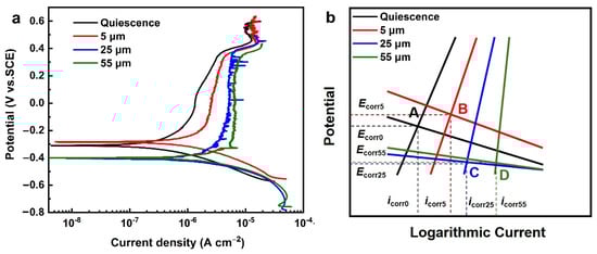 On the other hand, the corrosion potential (Ecorr) also presents some differences at different CE amplitudes. The Ecorr is about −310.7 mV at a static state (amplitude of 0 μm), and the value of Ecorr becomes −283.6 mV at a CE amplitude of 5 μm; the values of Ecorr reached 405.0 mV and 399.8 mV with the increase in CE amplitudes to 25 μm and 55 μm, respectively. The change of Ecorr should be closely related to anodic and cathodic reactions, including both anodic metal dissolution and cathodic oxygen transfer. More specifically, Ecorr is the equilibrium potential of cathodic and anodic reactions. Thus the ideal schematic polarization curves displayed in Figure 5b are adopted to explain changes in Ecorr at different CE amplitudes. At a low CE amplitude of 5 μm, increases in cathodic reactions are more significant than that of the anodic reaction due to stirring effects caused by CE-accelerated oxygen transfer. The anodic reaction does not change markedly because the cavitation intensity corresponding to 5 μm CE amplitude is lower than that of mechanical bearing capacity of passive films, which display good protective performance. Thus, coupling cathodic and anodic reactions results in an improvement of Ecorr (Point B in Figure 5b). With increased cavitation intensity corresponding to 25 μm CE amplitude, a contrasting change of the cathodic and the anodic reactions occurs in comparison to the case with 5 μm amplitude. Specifically, the increase in anodic reaction is more remarkable in comparison with the cathodic reaction due to destruction of passive films under high cavitation intensities; thus, Ecorr exhibits obvious decline (Point C in Figure 5b) compared with the static case (Point A in Figure 5b). Furthermore, Ecorr at a high cavitation intensity corresponding to 55 μm CE amplitude shows a similar change (Point D in Figure 5b) when compared to the case with 25 μm CE amplitude.
