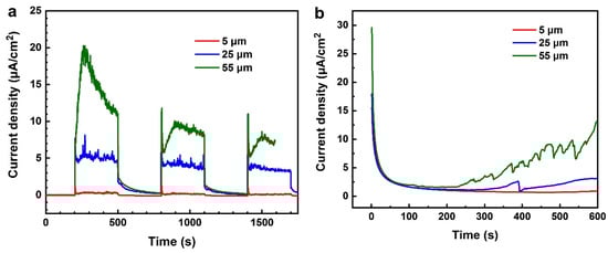 Figure 6b shows static potentiostatic polarization curves after CE for 40 min, and the applied potential is 0 V vs. OCP. The current density with different CE amplitudes shows a rapid decrease when CE is closed, reflecting a self-repairing process of 316L SS during the quiescent state. Current density maintains a stable value of 0.75 μA/cm2 after CE with 5 μm amplitude, implying that low CE amplitudes have little effects on the protection of passive films. In contrast, current densities with CE amplitudes of 25 μm and 55 μm are about 2.95 μ A/cm2 and 10.13 μA/cm2, respectively, after 600 s’ test, which reflects weak repassivation ability. Taken together, repassivation properties of 316L SS gradually weaken with increased cavitation intensity.
