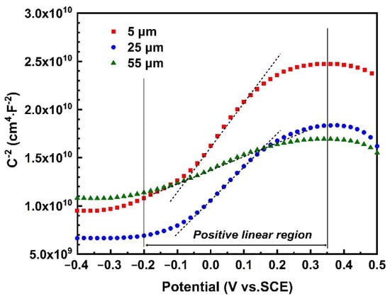 In order to evaluate the protection of passive films formed on samples with different CE amplitudes, Mott–Schottky plots were obtained, as shown in Figure 7. It should be noted that Mott–Schottky tests are carried out in the static state because they are sensitive to changes in the surroundings. It is clear that the slopes of Mott–Schottky curves under the three amplitudes are positive; that is, the passive films formed on 316L SS under the three types of CE amplitudes exhibit characteristics of n-type semiconductors. According to the Mott–Schottky equation for n-type semiconductors, some important parameters can be obtained [43]: