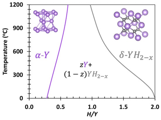 Phase diagram for the Y-H system (from [19,21] based on [14]). Crystal structures of α-Y and δ-YH2 shown in respective phases. Large purple spheres are yttrium atoms, whereas small grey spheres are hydrogen atoms.