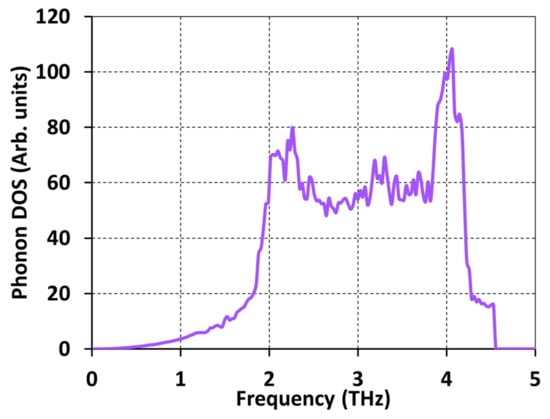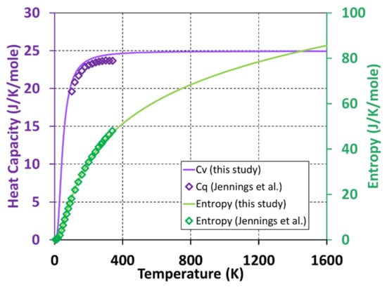Displacement structures for α-Y were created for the VASP/PHONOPY toolkit. Under the harmonic approximation, the phonon density of states for yttrium were produced (shown in Figure 3) for each finite displaced structure. As expected, the phonons are in acoustic range for yttrium metal. The phonon density of states was then utilized to generate the thermodynamic properties such as constant-volume heat capacity and entropy (Figure 4). Thermodynamic properties are in excellent agreement with the experiments by Jennings et al. [37]. The cv from this study is slightly overestimated (~3.5%) at ~340 K when compared to the lattice heat capacity (cq) from Jennings et al. [37], likely because cq ignores the electronic contribution. The entropies from this study and the literature were also compared to validate the DFT-generated α-Y properties, which are in excellent agreement with one another, also suggesting the validity of the generated phonons in this work.