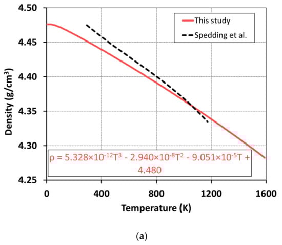 After the DFT harmonic approximation was verified, the thermal expansion was investigated using the DFT-QHA method. DFT-QHA is necessary to generate lattice expansion-related properties, such as density and bulk modulus. Lattice expansions are of utmost importance for high-temperature applications. The physical density and CTE as a function of temperature were calculated and are provided in Figure 5. The density results were validated against the X-ray experiments reported by Spedding et al. [36]. Nevertheless, the density shown in the figure appears to have a large difference when compared to the experimental measurements, since the maximum difference is only ~0.5%. All the validations provided here support the underlying DFT modeling utilized for α-Y metal for the purpose of this paper.