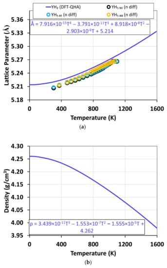 To understand temperature-dependent lattice expansion, earlier QHA models (similar to the ones utilized for α-Y) were adopted for YH2 from our previous work [20]. In that work, only thermal lattice strain () and constant-pressure heat capacity were provided strictly for validating the underlying phonons. However, in this work, remaining thermal expansion parameters including elastic moduli are extended and combined with those of α-Y in the two-phase field to enable the stoichiometry- and temperature-dependent understanding of the yttrium hydride material. Figure 6a presents the DFT-QHA-computed lattice parameters as a function of temperature for YH2. For validation, LANSCE neutron diffraction experiments are also shown. There is an over-prediction in the DFT lattice parameters of about 0.2% when comparing to the high-temperature neutron diffraction experiments. It is obvious from the neutron diffraction experiments that the lattice expansion of the YH2 phase is stoichiometry-independent (stoichiometry of the entire compound, i.e., including varying amounts of α-Y). In other words, the CTE are independent of for yttrium hydride, as shown by Figure 6a. Since the CTE changes with varying stoichiometries are negligible, as shown by neutron diffraction experiments, and since QHA modeling requires extensive computational resources, QHA analysis was not extended for sub-stoichiometric yttrium hydride. As such, the CTE for YH2 is utilized for all yttrium hydride sub-stoichiometries.