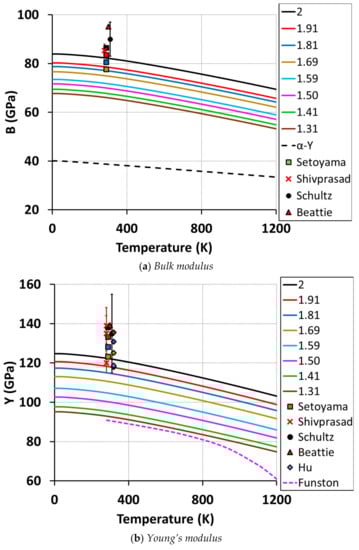 The room temperature errors with various publications in the literature are provided in Table 1. Note that the DFT-QHA data for various moduli are modeled in single-phase; however, the experimental data should exist in a mixture of binary phase according to the phase diagram in Figure 1. The DFT-QHA-model-predicted data is off by ~6% and ~15% on average compared to the most recent experimental data [17,20], as the experimental data contains a real two-phase system. The work of Schultz et al. [13] compares excellently with our data because of the size of their uncertainties. For the Young’s modulus, our results are over-predicted compared to Funston et al. [10] and Hu et al. [20]; under-predicted compared to Setoyama et al. [8] and Beattie et al. [11]; and within the error bars for Shivprasad et al. [17] and Schultz et al. [13]. This shows that DFT-QHA results are within the acceptable range when compared to available experimental literature. The differences in our data when compared to the literature arise due to two primary assumptions made in our DFT-QHA models: (1) the single-phase single crystal ignores the mismatches from true binary phases since the - is completely excluded, and its influence on binary-phase elastic properties are different than single-phase; (2) was treated as independent of temperature, which will slightly affect the DFT results between 0 K and 300 K. Typically, DFT and experimental results are compared at 0 K and room temperature, respectively; and (3) the utilization of the GGA-PBE method for DFT-QHA tends to under-predict the moduli. Even with discrepancies as high as 10% at room temperature, this data will prove to be useful at reactor temperatures (>~900 K) where the crystal is in single phase. Unfortunately, there is no experimental data to validate the high-temperature regime; however, this is where the DFT models from this study can be used to fill the gaps.