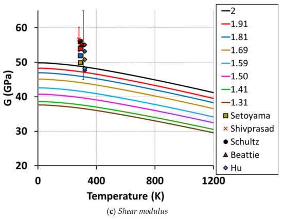 The DFT-QHA approach also calculates the bulk moduli (B) as a function of temperature. The latter is essential for thermomechanical analysis for nuclear reactors. Since all overall stoichiometries share the same CTE for the δ-YH2 phase up to H dissociation temperatures, the stoichiometry-dependent bulk modulus from Mehta et al. [19] in Figure 7a can be extrapolated to higher temperatures. In reality, the Poisson’s ratio or will vary slightly as a function of temperature. However, if is treated as independent of temperature, Young’s modulus or Y (Figure 7b) and shear modulus or G (Figure 7c) as a function of stoichiometry and temperature can also be obtained. This is possible due to the widely known relations described in Equations (1) and (2), below. The stoichiometry dependence of was also obtained from Mehta et al. [19].