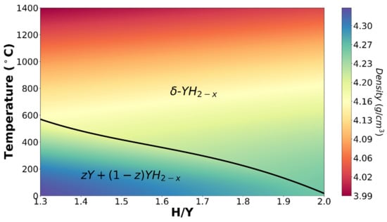 The temperature-dependent density relations described in Figure 5 for -Y and Figure 6 for -YH2, and the stoichiometry-dependent lattice parameter relation described by Mehta et al. [19], are used to derive the two-phase density (Figure 8). We emphasize that this result is different from Fig. 10 in [19], as in that paper the CTE effects were ignored. Yttrium hydride increases in density towards lower stoichiometry and lower temperatures in the two-phase region. At temperatures above 600 °C, hydrogen stoichiometries between are all in single phase. Single-phase YH2−x increases in density with increasing H/Y and decreasing temperature. Combining the results from Mehta et al. [19] and Figure 6, the single-phase density for δ-YH2−x or can be written in equation format, as shown in Equation (6). This equation is valid for stoichiometry between and temperatures up to which hydrogen diffusion or dissociation (equilibrium-pressure-dependent) are observed. The overall stoichiometry of the candidate moderator materials is around 1.8 with an expected gradient all within this validity range. The simplified equation below considers CTE effects due to temperature (in K) and stoichiometry effects due to the vacancy formation in single-phase yttrium hydride. The following equation also suggests that the density is more affected by temperature than the stoichiometry,