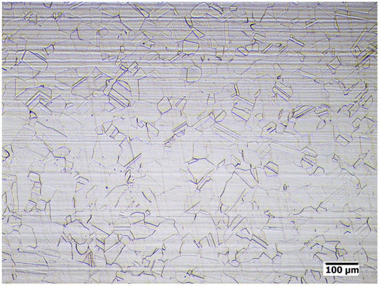 After heat treatment, the specimens were etched in a HNO3 + H2O solution in an electrolytic cell using AISI 316L as the cathode. The microstructure was then analyzed using a light microscope (Eclipse LV150 NL, Nikon, Tokyo, Japan), and for the fully recrystallized samples, image analysis was performed using dedicated software (AlexaSoft, X-Plus, serial number: 6308919690486393, Florence, Italy). From the image analysis, it was possible to determine and compare the average grain size of AISI 904L steel as a function of the thermomechanical conditions.