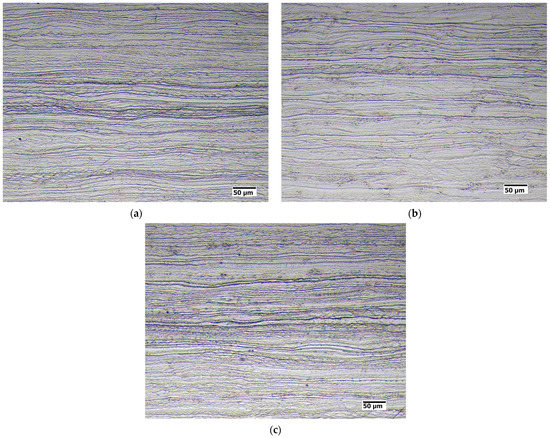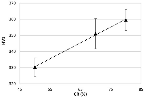 Figure 1 shows a fully recrystallized material characterized by a homogeneous structure dominated by equiaxic grains. The cold-rolled material’s microstructure evolution with increasing deformation rate is reported in Figure 2. This microstructure evolution leads to the work-hardening behavior reported in Figure 3 in terms of hardness.