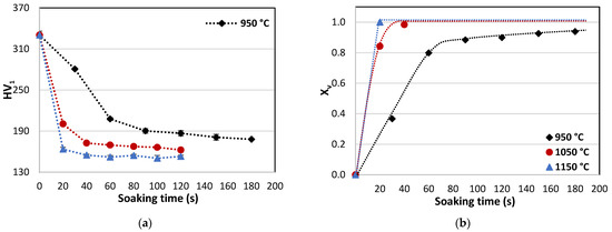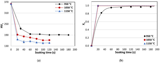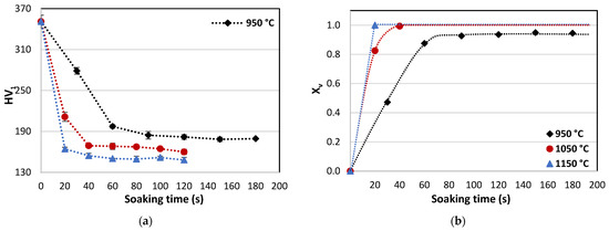 The recrystallized volume fraction (Xv) was evaluated starting from the hardness measurements according to Equation (1) based on [60]: