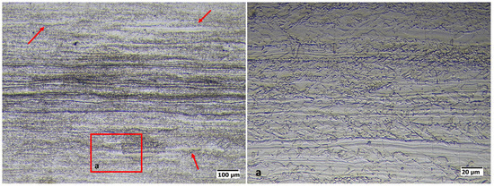 AISI 904L steel after cold rolling at 50% and annealing at 950 °C for 180 s (red arrows indicate the partially recrystallized areas).