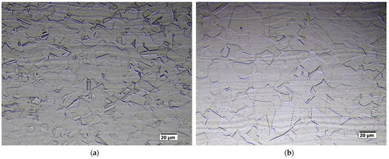 AISI 904L steel after cold rolling at 50% and annealing at (a) 1050 °C for 40 s and (b) 1150 °C for 20 s.
