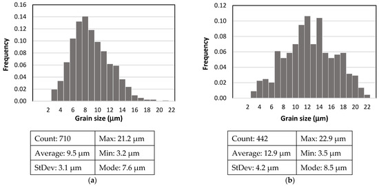 Grain size distribution of AISI 904L steel after cold rolling at 50% and annealing at (a) 1050 °C for 40 s and (b) 1150 °C for 20 s.