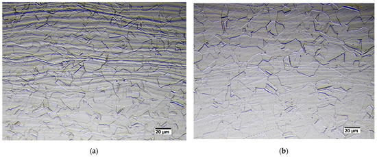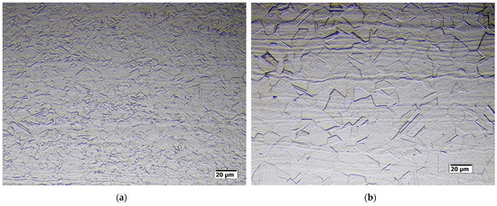 AISI 904L steel after cold rolling at 70% and annealing at (a) 1050 °C for 40 s and (b) 1150 °C for 20 s.