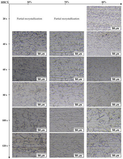Grain growth evolution in AISI 904L as a function of the cold rolling ratio (CR: 50%, 70%, 80%) after annealing treatment at 1050 °C and soaking times in the range of 20–120 s.