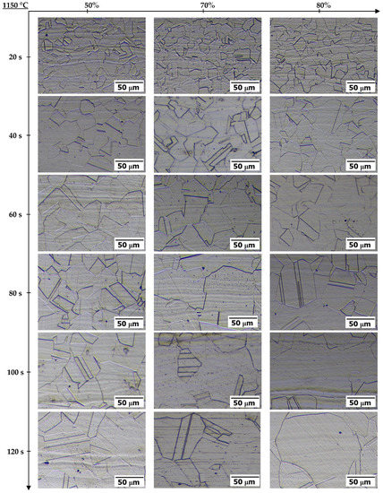 Grain growth evolution in AISI 904L as a function of the cold rolling ratio (CR: 50%, 70%, 80%) after annealing treatment at 1150 °C and soaking times in the range of 20–120 s.