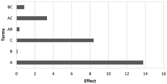 The GLM allows one to evaluate the influence of individual parameters, as well as the influence of their interactions (double interaction in this case study). The results of the analysis are shown in Figure 15. By looking at the Pareto chart, it is easy to understand which parameters have a greater effect according to the software. The interpretation of p–value coefficients, therefore, confirms the assessments referred to in the graph, with the p-value being defined as the probability of obtaining results at least as extreme as the observed results of a statistical hypothesis test. A smaller p-value means that there is stronger evidence in favor of the alternative hypothesis. In particular, for p > 0.05 (called the level of significance), the probability of error in not considering a variable is considered low. Otherwise, if the p-value is lower than 0.05, the parameter must be considered in the analysis and is relevant for the process. The p-values associated with the parameters and their interactions are shown in Table 4. Referring to the condition expressed above, the reduction ratio (B), the temperature–reduction ratio (AB) and the soaking time–reduction ratio (BC) show values higher than 0.05, meaning they can be removed from the analysis.