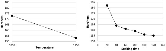 As expected, the temperature and soaking time are the terms with a meaningful effect on the process, which is in accordance with the results obtained through laboratory analysis. During an annealing process, a higher treatment temperature and a longer soaking time will affect the hardness of the material, as shown in Figure 16.