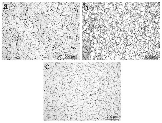Microstructure of the as-homogenized ingot alloys: (a) Al-0.2Fe-0.06Cu; (b) Al-0.2Fe-0.06Cu-0.1La; (c) Al-0.2Fe-0.06Cu-0.15La.