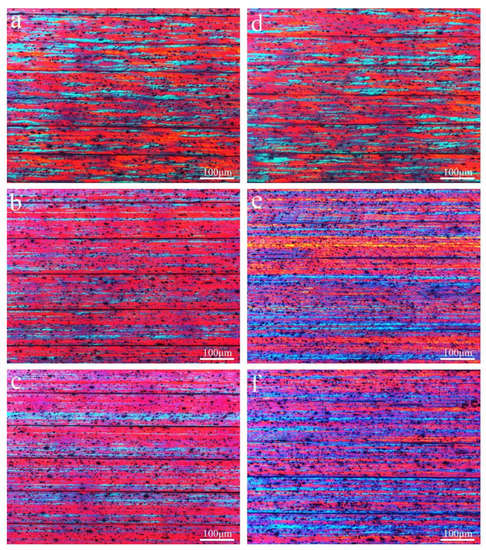Figure 2 shows longitudinal section microstructures of the foil alloy in different states. Figure 2a–c are metallographic micrographs of different alloys in the cold-rolled state. It can be observed that the grains (slender fibrous structure) of the alloys were stretched and flattened along the rolling direction, showing fibrous tissue. In the La-free alloy (Figure 2a, Al-0.2Fe-0.06Cu), the structure was relatively coarse. When La content was 0.1wt.% (Figure 2b, Al-0.2Fe-0.06Cu-0.1La) and 0.15wt.% (Figure 2c, Al-0.2Fe-0.06Cu-0.15La), the microstructures were significantly refined, and strip-shaped fibrous tissue was tighter. Figure 2d–f are the metallographic micrographs of Al-0.2Fe-0.06Cu alloy with different La addition after heat-treatment of the cold-rolled alloy at 120 °C for 10 h. The variation of heat-treated alloy microstructure with La content was basically consistent with that of the cold-rolled state.