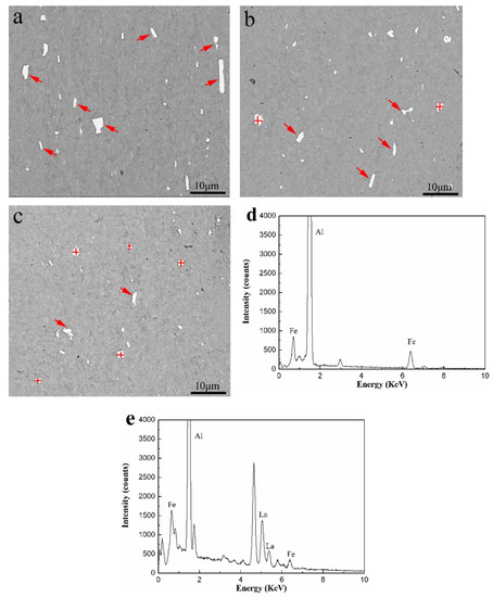Figure 5a–c present SEM images of Al-0.2Fe-0.06Cu alloys with different La addition after heat treatment at 120 °C for 10 h. The polished surface was parallel to the rolling direction. There were many micrometer-sized particles dispersed in the Al matrix in the three alloys and their shapes were various, including rod-shaped bars, quadrangles, ellipsoids and irregular shapes. It could be determined through the energy X-ray spectrometer (EDS) patterns (Figure 5d,e) that the particles indicated by the arrow and cross marks in Figure 5a–c were AlFe and AlFeLa phases, respectively. Combined with the testing results of the XRD diffraction pattern (Figure 4), it could be further determined that the AlFe particles were Al13Fe4 and Al6Fe [19,20,21]. The morphology of particles with different compositions was also different. Most of the AlFe phases had a rod-shape and the size was relatively large. The AlFeLa phases were ellipsoidal and smaller. Compared to the La-free alloy (Figure 5a, Al-0.2Fe-0.06Cu), the AlFeLa phase appeared in the La-containing alloy (Figure 5b, Al-0.2Fe-0.06Cu-0.1La) and the number of AlFe particles was significantly reduced with a smaller size. As the La content increased to 0.15wt.% (Figure 5c, Al-0.2Fe-0.06Cu-0.15La), it was simultaneously observed that the number of AlFeLa phase began to increase. The quantity of AlFe particles was further reduced. With the addition of La, the size of the Al3Fe phase decreased as the rare earth La had strong chemical properties and was easy to gather around the second phase [4,5].