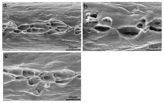 Figure 7 shows the fracture surface of the alloys after the tensile test at 50 °C. The microscopic morphology of the tensile fracture was very similar to that of the room-temperature tensile fracture, i.e., the ductile-dominated fractures with dimples as the main morphology. With the increase in testing temperature, the area of the dimples increased. Comparing Figure 6 and Figure 7, it could be further found that the fracture morphology of the alloy under different tensile conditions was similar. As the testing temperature increased, the number of dimples at the fracture surface increased. Therefore, the plasticity of the alloy was better at 50 °C.