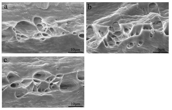 Tensile fracture morphology of the heat-treated foil alloys tested at 50 °C: (a) Al-0.2Fe-0.06Cu; (b) Al-0.2Fe-0.06Cu-0.1La; (c) Al-0.2Fe-0.06Cu-0.15La.
