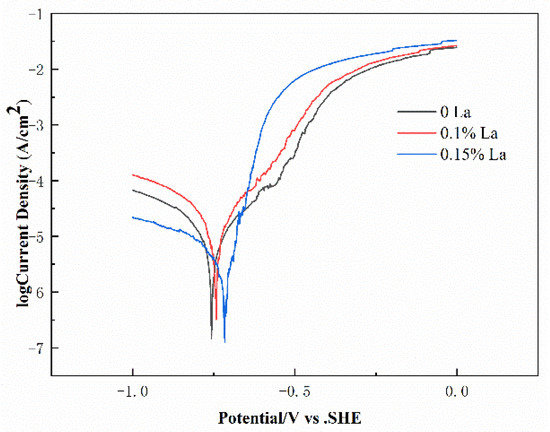 The Tafel polarization curves of the heat-treated alloys in 3.5wt.% NaCl solution were measured to characterize the alloy’s electrochemical characteristics. The polarization curve is shown in Figure 8. It can be seen that the shape of the polarization curves of the alloys with different La content had little difference. As the La content increased, the polarization curve shifted to the positive direction. Self-corrosion potential and corrosion current density are two major parameters of electrochemistry. The more positive the self-corrosion potential, the less prone the alloy is to electrochemical corrosion. A smaller corrosion current density means slower corrosion rate when the alloy undergoes electrochemical corrosion [35]. Table 3 shows the electrochemical parameters of the alloys obtained from Tafel polarization curves [36], where Ecorr and Icorr represented the self-corrosion potential and corrosion current density, respectively. It can be seen in Table 3 that, as the La content increased, the alloy’s self-corrosion potential became more positive, and the corrosion current density of the alloy became smaller. This indicated that, with the increase in La content, the tendency of electrochemical corrosion of the alloy became weaker, and the rate of electrochemical corrosion of the alloy became slower.