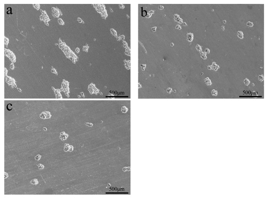 SEM images of corrosion surface of the foil alloys: (a) Al-0.2Fe-0.06Cu; (b) Al-0.2Fe-0.06Cu-0.1La; (c) Al-0.2Fe-0.06Cu-0.15La.