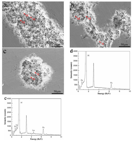SEM images and energy dispersive X-ray spectroscopy (EDS) patterns of corrosion surface of the alloys: (a) Al-0.2Fe-0.06Cu; (b) Al-0.2Fe-0.06Cu-0.1La; (c) Al-0.2Fe-0.06Cu-0.15La; (d,e) EDS pattern of AlFe particle (M) and AlFeLa particle (N).
