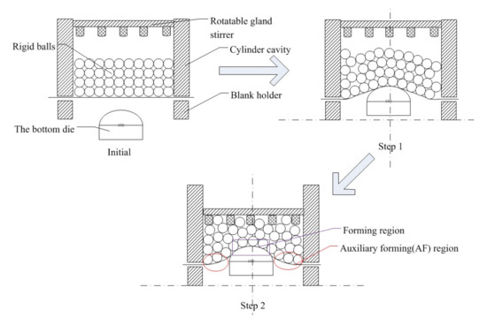 In this experiment, the commercial magnesium alloy AZ31 with the size of 200 mm × 200 mm × 1.5 mm was employed, and the compositions were listed in Table 1. The forming device of CBS is shown in Figure 1, and fundamental parameters are listed in Table 2. As shown in Figure 2, the forming device included the following sections: rotatable gland stirrer, rigid balls, cylinder cavity, blank holder, and the bottom die. The forming process of AZ31 sheet was shown in Figure 2, and the detailed experimental steps were shown as follows: Prepared magnesium alloy sheet was placed between the blank holder and the cylinder cavity (applied with 2.5 MPa pressure), while allowing the rotatable gland stirrer to contact with rigid balls and the bottom die to contact with the magnesium alloy sheet. It can be seen from Figure 2 that the forming process is divided into two steps: Step 1 was that the bottom die rose while the rotatable gland stirrer was not moved and rotated. Step 2 was the bottom die rose while the rotatable gland stirrer was moved down and rotated. It can be known that rigid balls have a complicated influence on the sheet forming, which needs further analysis by theoretical formula and FE simulation.