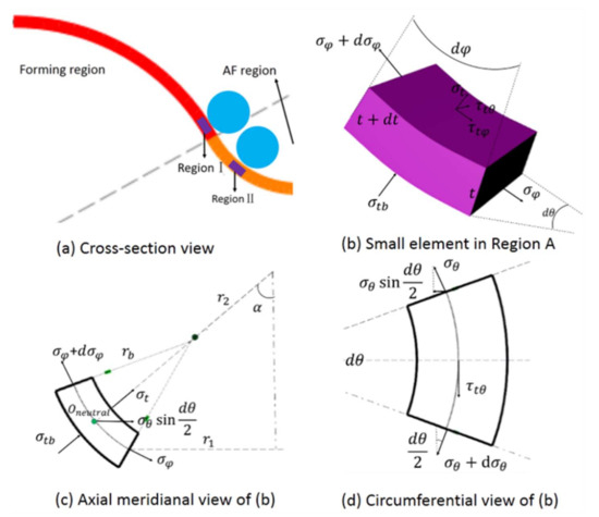 In order to explore the stress state at the boundary of the die, membrane analysis of the contact stresses on the neutral surface was conducted to develop a theoretical model. Silva et al. [19] proposed a theoretical model for stress analysis based on membrane approach to address the material deformation in ISF process. Chang et al. [20] updated the membrane theory by taking into account the hardening of the material. In the present work, membrane analysis was applied to the CBS process. Figure 3a showed the two contact regions between rigid balls and the sheet in the forming regions and AF regions. Figure 3b showed the stress components on a small element in region A. As shown in Figure 3c,d, along the directions of thickness t, circumference and meridian , the corresponding stress components ,,, were considered in the membrane analysis. represents the opposite stress of the rigid ball on the sheet, while defined as the stress of the bottom die acting on the sheet. represents the thickness of the sheet, and represents the radius of the rigid ball. The assumptions of the theoretical analysis were summarized as,