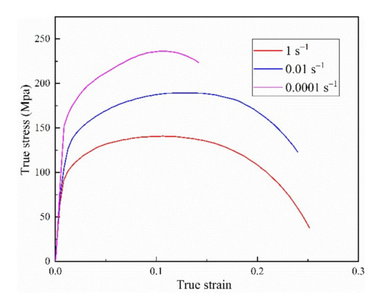 A series of tests at different strain rates were carried out to determine the model parameters. The dominant forming temperature in the CBS forming process is 423 k. Figure 4 illustrated that the stress-strain relationship at different strain rates at 423 K. It can be seen from Figure 4 that the stress is in a relatively stable state when , and the stress at this strain is called .The equation can be obtained by taking the natural logarithm to Equation (17).
