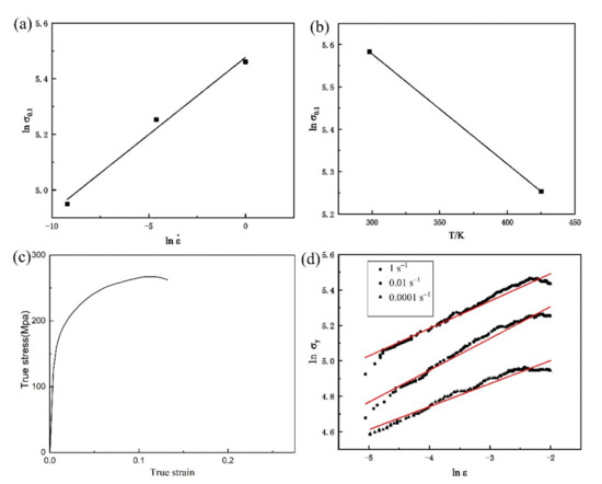 The parameter can be calculated as list: (a) The relationship between and ; (b) The relationship between and T; (c) Tension (true) responses at 0.01 s in the temperature of 298 K; (d) The relationship between and .