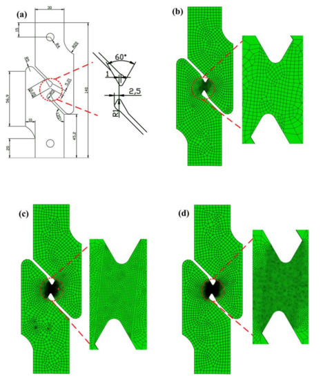 Sample geometry and three models with different number of meshes: (a) Sample geometry; (b) Model with 6852 elements, 3 layers; (c) Model with 14,720 elements, 4 layers; (d) Model with 37,420 elements, 5 layers.