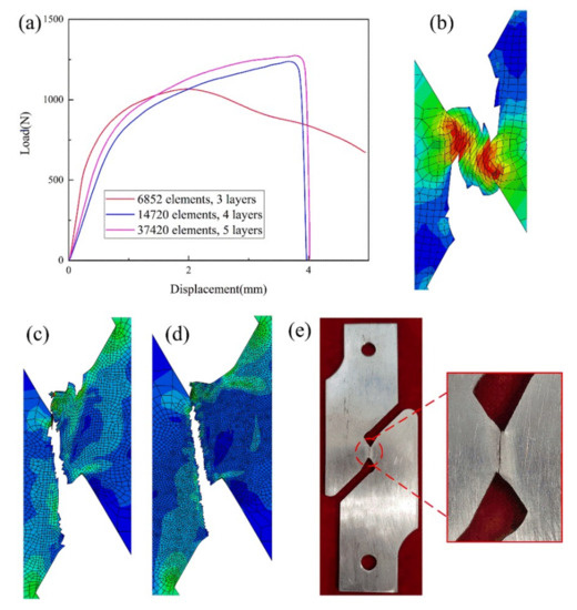 In order to verify the accuracy of the constitutive model, the shear-tensile test was established and simulated by ABAQUS/Explicit. The GTN damage model was integrated with ABAQUS/Explicit through user-defined material parameters. It can be seen from Figure 6 that three models with different numbers of meshes were built separately, in order to compare the influence of the number of meshes on the results of numerical simulations. Theoretically, the constitutive model in the paper requires a comparatively low number of meshes, and it is important to choose the suitable amount of mesh. Figure 7 showed the Load-Displacement curves results and crack shapes of models with different numbers of mesh. When the model was meshed with 6852 elements and 3 layers, it can be seen that the simulation results are completely different from the other two and do not match the actual situation in terms of crack shape. The most suitable number of meshes is 14,720 with 4 layers, and the increasing number of meshes had a little influence on the calculation results when compared with the model of 37,420 elements both in crack shape and the Load-Displacement curves. The simulation of the CBS forming process is more complex and reducing the number of meshes can greatly improve the efficiency of the simulation without influencing the accuracy of the simulation. In order to explore the effect of on the simulation results, the values of parameter are set to 0, 1, 2, 3, respectively. It can be seen that is a more accurate damage parameter in the shear-tension model. It can be seen from Figure 8 that when increased, the elongation of the material decreased.