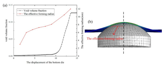 The purpose of Step 1 was to make the sheet contact with the bottom die and increase the size of the forming region. The effective forming radius used to define the size of the forming region and the variation of maximum void volume fraction of the sheet in Step 1 was shown in Figure 10. It should be noticed the maximum void volume fraction increased rapidly when the displacement of the bottom die increased to 10 mm and the growth rate of effective forming radius decreased. It can be concluded the suitable displacement of the bottom die was 5 mm and the growth rate of the effective forming radius reached the maximum without increasing void volume fraction.