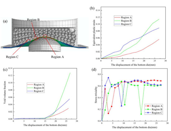 According to the damage evolution Equations (15) and (17) during plastic forming, the equivalent plastic strain was an important factor that led to material failure. It can be seen from Figure 12b the equivalent plastic strain of all regions increased with the displacement of the bottom die at different regions and the maximum strain took place at Region B, which is the boundary of forming region and AF region. Besides, the equivalent plastic strain of Region C increased due to the pressure of rigid balls. In fact, the effective forming radius increased by the extra pressure. When the bottom die reached the displacement of 27.3 mm, the void of fraction reached the maximum at Region B and crack occurred. Besides, the effective radius reached 25 mm which is similar with the result of the experiment (24.7 mm). It can be concluded that CBS forming process can improve the forming limit of the sheet and the effective forming radius. Figure 12d shows the evolution of stress triaxiality in different regions and the stress triaxiality decreased when the rigid ball pressed on the surface of the sheet. It can be found that the stress triaxiality influenced by the rigid balls and it is necessary to apply modified GTN model to the FE simulation.