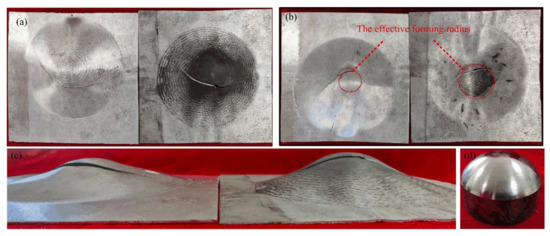 Figure 13 shows the photographs of cracked AZ31 magnesium alloy in CBS forming process. It can be seen from Figure 13 that the displacement of the bottom die increased from 14 mm to 27 mm and the maximum effective increased from 12.5 mm to 24.7 mm. It can be concluded that the rotation of rigid balls can improve the forming limit of AZ31 magnesium alloy and increase the effective forming radius. In order to explore the mechanism of deformation, the microstructure of curved surface was tested by EBSD.
